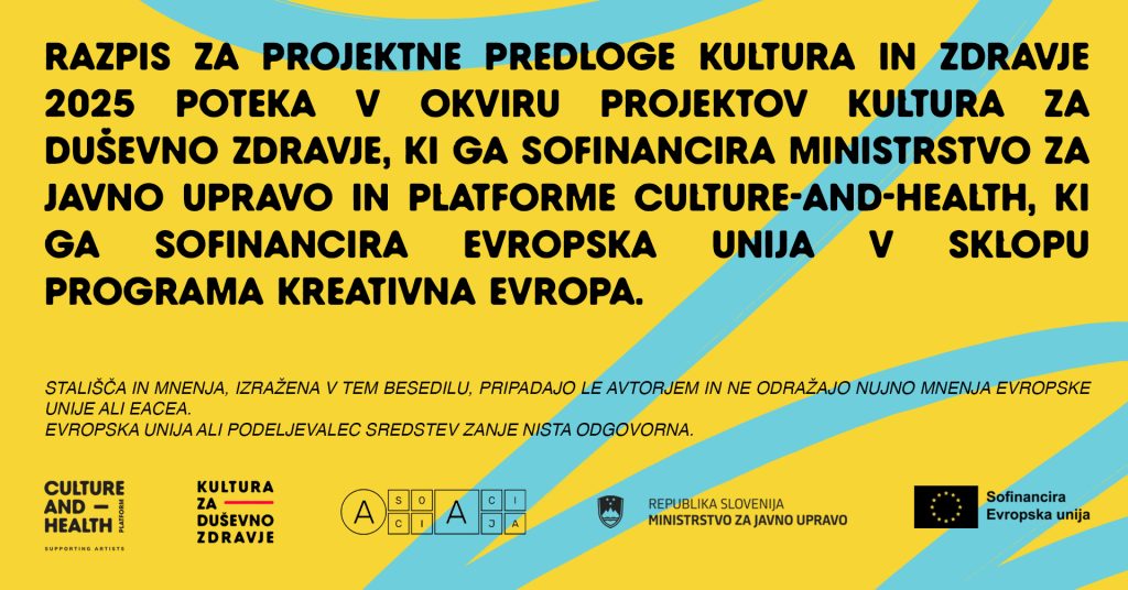 Razpis za projektne predloge Kultura in zdravje poteka v okviru projektov Kultura za duševno zdravje, ki ga sofinancira Ministrstvo za javno upravo in platforme CultureAndHealth, ki je sofinancirana s strani Evropske unije, v okviru programa Kreativna Evropa