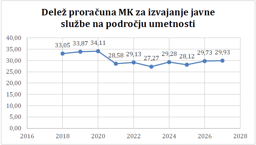 Kot smo v društvu že izpostavili, uvedbo minimalnih postavk močno podpiramo, hkrati pa smatramo, da je treba nasloviti bojazen, da bodo zaradi uvedbe javni zavodi prisiljeni v varčevanje in da se bo obenem zaradi boljšega plačila siromašilo nevladni sektor. Ministrstvo za kulturo bi moralo oceniti dodatne stroške javnih zavodov in poskrbeti, da iz tega naslova ne bodo prisiljeni v krčenje programov ali druge varčevalne ukrepe. V tem kontekstu je zanimivo, da delež proračuna Ministrstva za kulturo, ki se namenja izvajanju javne službe na področju umetnosti, kot prikazuje spodnji graf, v resnici upada.
