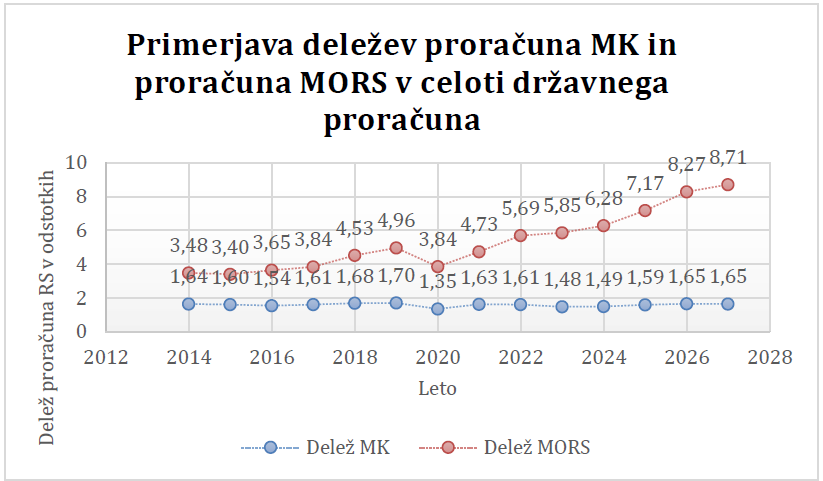 Ocenjujemo, da bi bil takšen odstotek smiselno zastaviti tudi kot nacionalni cilj v strateških dokumentih države na tem področju, npr. Resoluciji o nacionalnem programu za kulturo. Stagnacija deleža, ki se namenja za kulturo, je vprašljiva tudi z vidika primerjave z drugimi resorji. V spodnjem grafu predstavljamo primerjavo deleža proračuna RS, ki ga namenjamo za Ministrstvo za obrambo, in delež, ki se namenja Ministrstvu za kulturo.