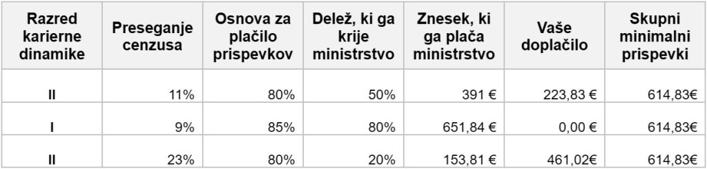 Uvrščeni ste v II razred karierne dinamike in primer cenzus presegate za 11%. To pomeni, da vam bo ministrstvo pokrilo 50% prispevkov od osnove, ki znaša 80% povprečne plače. To pomeni, da vam bo ministrstvo pokrilo prispevke v višini 391 eur, vi pa boste plačali preostanek do 614,83, torej 223,83 eur.